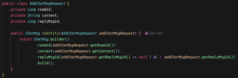예로 사진과 같이 새로운 채팅방을 만들어 생성된 채팅방의 정보와, 채팅방 내부의 이용자 정보를 한번에 보내기 위해 ViewChatRoomResponse를 변도로 만들어 담아 보내주었다.